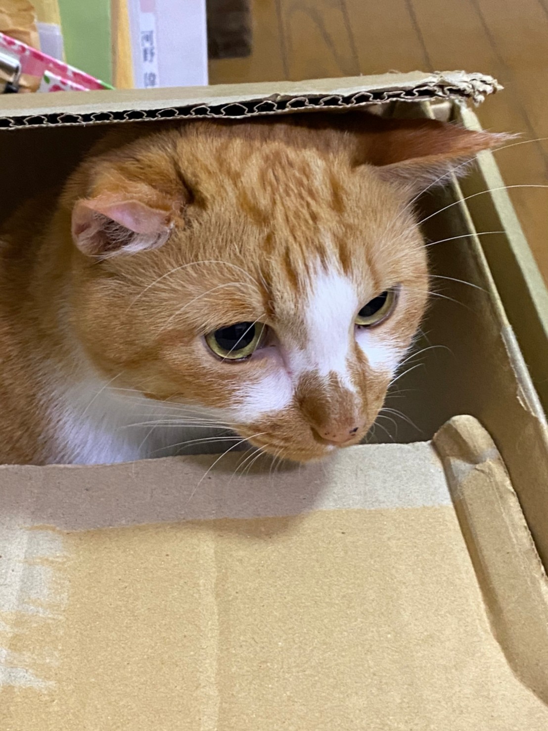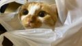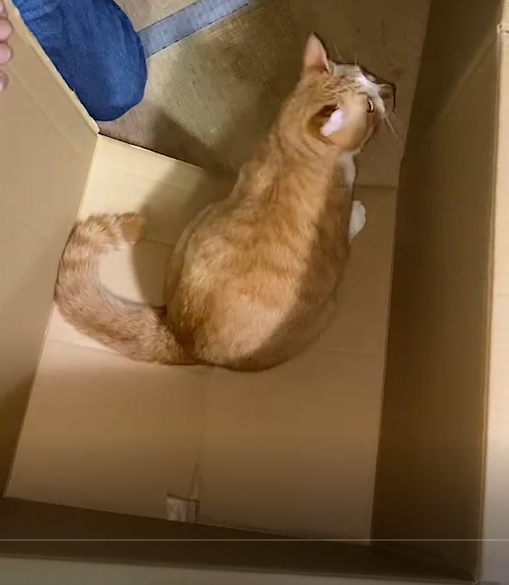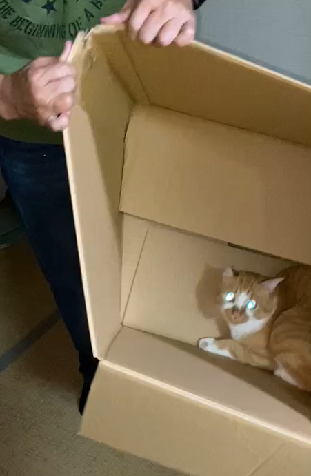 捨てようとした途端段ボールに飛び入り、揺らしても「絶対ここを動くもんか!」とばかりにびくともしない…