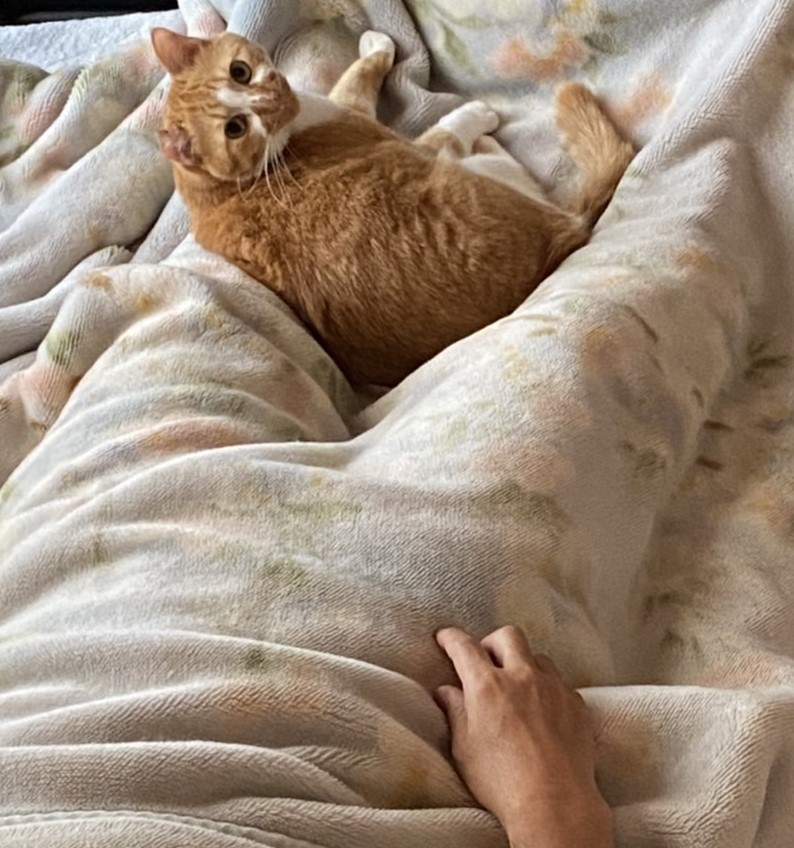 足を広げて寝てると、ちょこんとのその間に入って寝るのでそのままの体勢で動くことができない…。