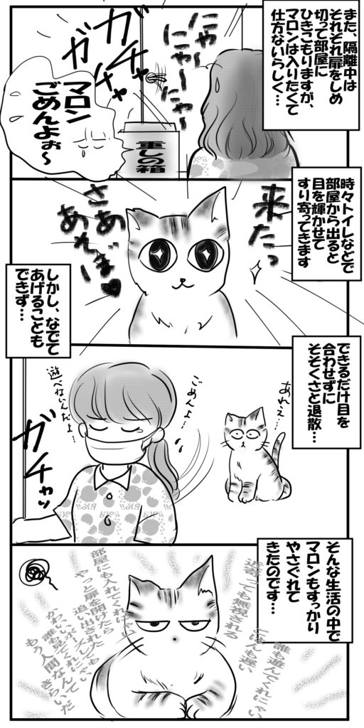しかし、動物への感染についてはデータも少なく、海外では少数ながら感染例もあるということで、陽性者はマロンとの接触は極力控え、部屋にも入れないことに…。