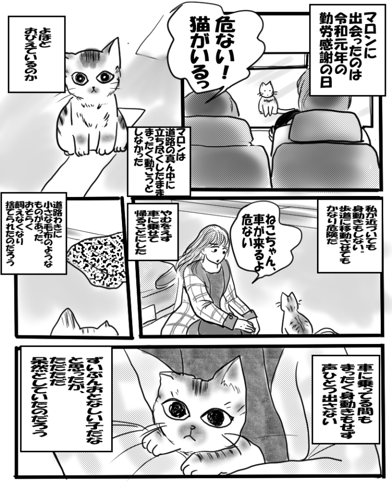 それはパンデミック前の令和元年勤労感謝の日、熊本にある実家に帰っている時に、車道のど真ん中で立ち尽くしていたのが子猫時代のマロンでした。