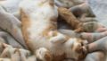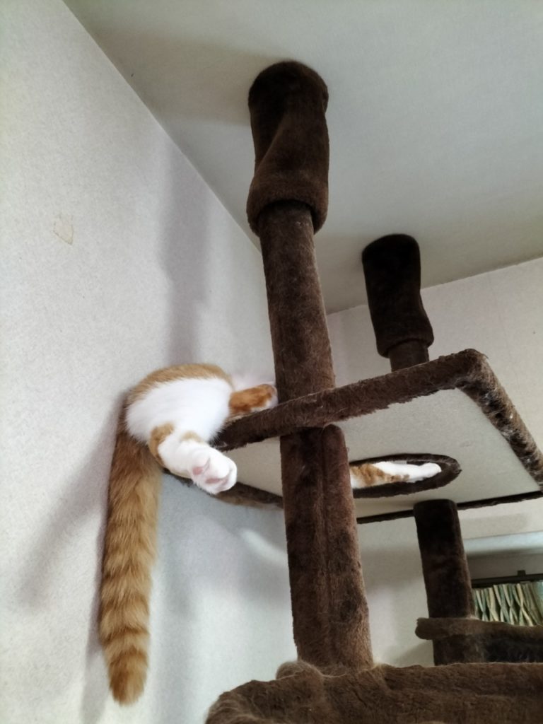 最近、キャットタワーがずしんと来る体重に…。はみだして、かわいい肉球が丸見えだよぉー